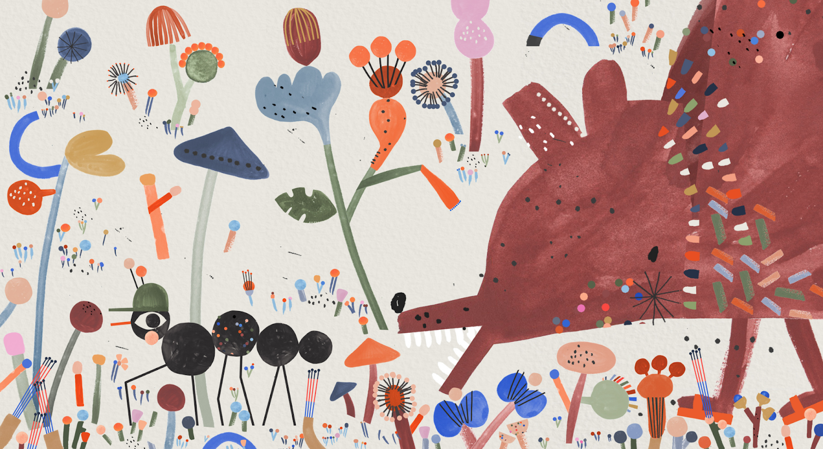 's illustrations for “Into the Wind” using collaged watercolour and watercolour to create a world of creatures of all sizes.