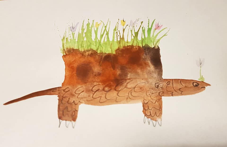 This image gave me great joy, it is a turtle emerging from hibernation, apparently, they walk with this mound of earth which has been insulating them from the winter, until they reach the water. I had to draw some.