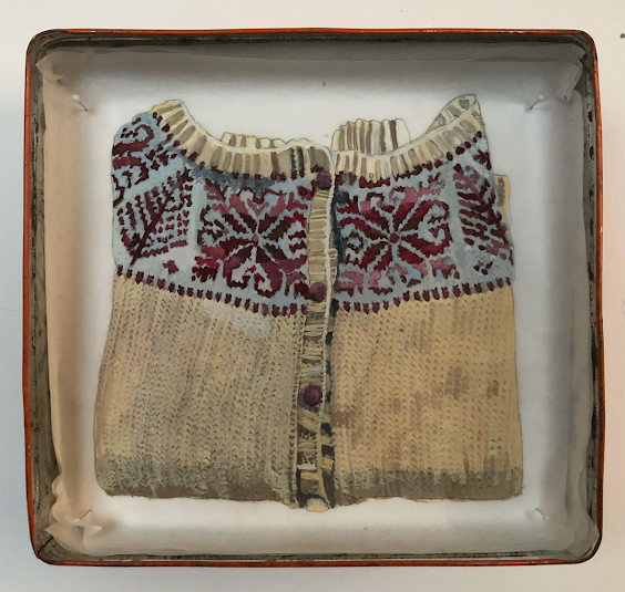 Old clothes painted on old clothes, fragments of linens and cloth, beautiful studies in acrylic and coloured pencil by Françoise Delot-Rolando from her series 'Fragments of clothing'.